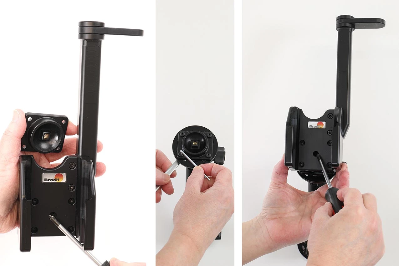 The holder is equipped with a tilt swivel so you can easily adjust the angle for better viewing, or switch between portrait and landscape mode. Tilts 17° and swivels 360°. Mounting plate 42x50 mm with 4 mm AMPS-holes. Made of high grade black ABS/Acetal plastic. Color: black. Made in Sweden. Attach onto a Pedestal Mount.