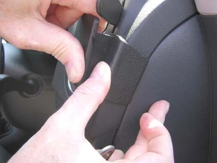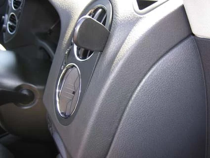 Press the ProClip rightwards so the curved left edge hooks behind the frame surrounding the air vent. Press fowards on the right side of the ProClip so the angled right edge hooks into the gap in the dashboard sidewall. Pull out the gap opener.