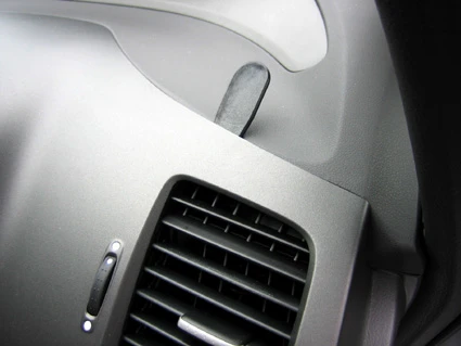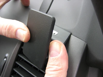 Press the thin end of the enclosed gap opener into the gap between the frame surrounding the air vent and the dashboard, to widen the gap. Peel off the adehsive tape covers on the ProClip.