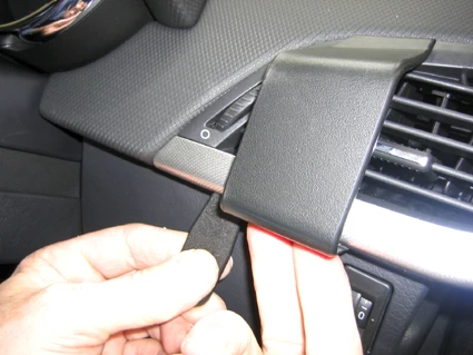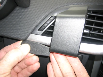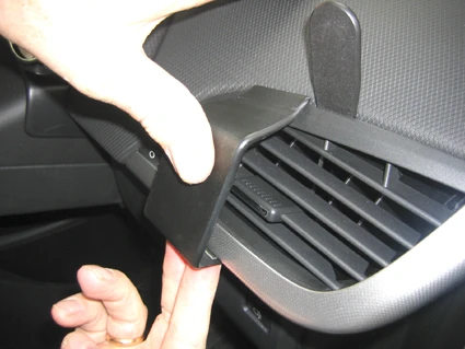Press the gap opener into the gap between the frame surrounding the air vent and the dashboard. Press forwards on the upper part of the ProClip so the angled upper edge hooks into the gap next to the gap opener. Press downwards on top of the ProClip so the angled edge goes all the way into the gap. Pull out the gap opener.
