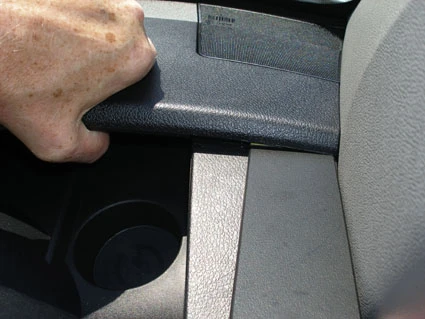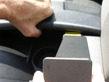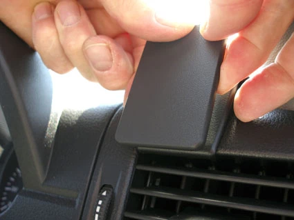 Peel off the adhesive tape covers on the ProClip. Grab a hold of the dashboard overhang and pull it upwards, in the same time hook the angled edge on the upper part of the ProClip behind the panel under the the dashboard overhang.