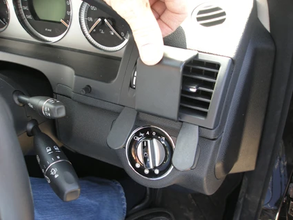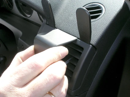 Press the gap openers into the gap between the frame surrounding the air vent and the dashboard, below the air vent. Press forward on the ProClip so the angled edge on the lower part goes into the gap between the gap openers.