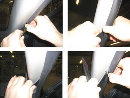 Peel off the cover of adhesive tape on the ProClip. Press the thin end of the enclosed gap opener into the gap between the A-post panel frame and the rubber sealant. Pull/flip the rubber sealant open. Pull out the gap opener.