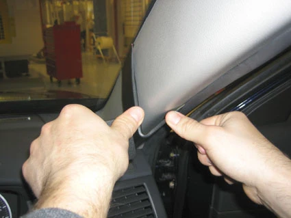 Press the gap opener into the gap between the A-post panel frame and the windshield. Press firmly upwards with your left hand on the bottom part of the ProClip and leftward on the right side of the ProClip with your other hand. Press until you see or hear/feel the angled edge on the upper part of the ProClip snap around the A-post panel edge. Pull out the gap opener.