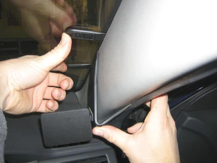 Insert the angled edge on the lower part of the ProClip into the gap and hook it behind the A-post panel edge.