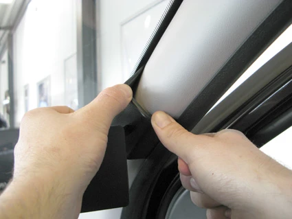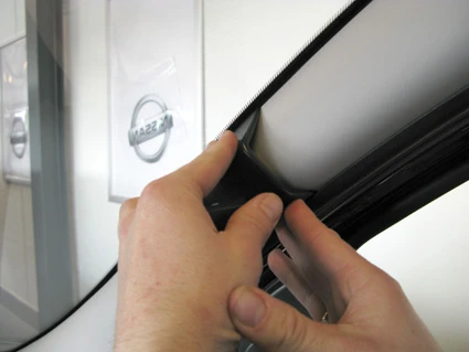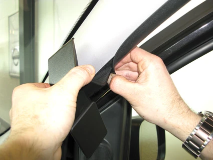Pull out the rubber sealent by the A-post slightly. Hook the angled edge on the lower part of the ProClip behind the A-post, under the rubber sealent.