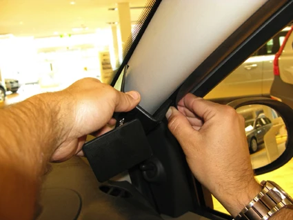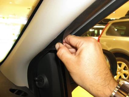 Pull the rubber sealant on the A-post slightly open. Peel off the adhesive tape covers on the ProClip