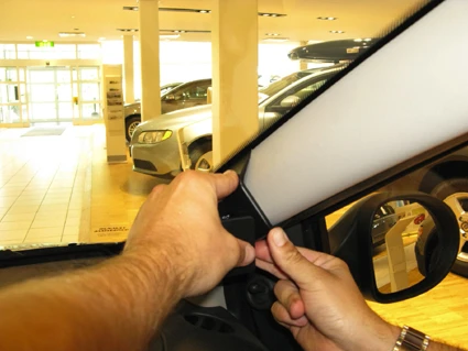 Press firmly upwards with your right hand on the bottom part of the ProClip and rightward on the left side of the ProClip with your other hand. Press until you see or hear/feel the angled edge on the upper part of the ProClip snap around the A-post panel edge by the windshield.