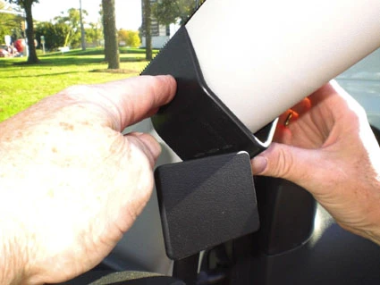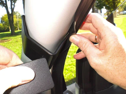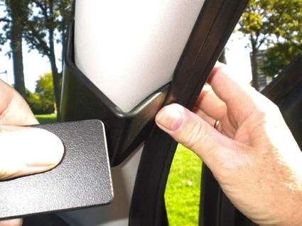 Hook the angled edge on the lower part of the ProClip into the gap between the rubber sealant and the A-post panel.