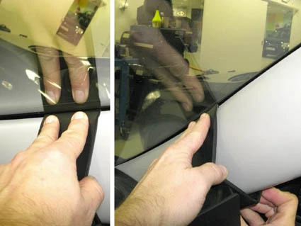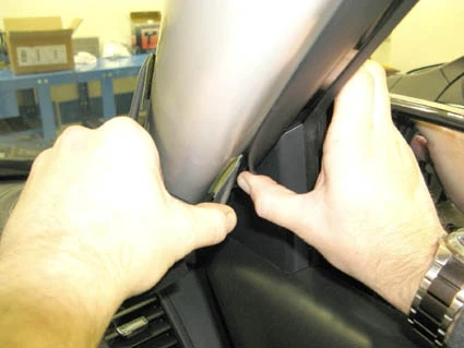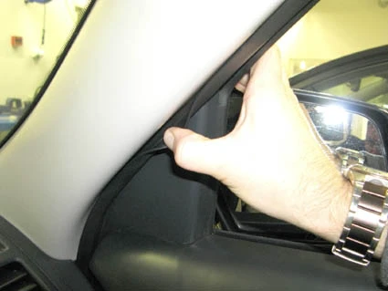 Peel off the adhesive tape covers on the ProClip. Pull out the rubber sealent on the A-post slightly to widen the gap.