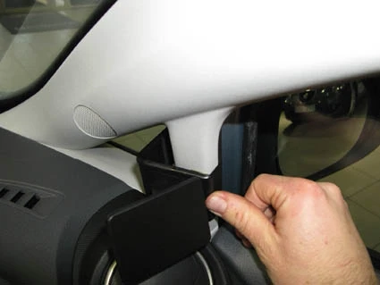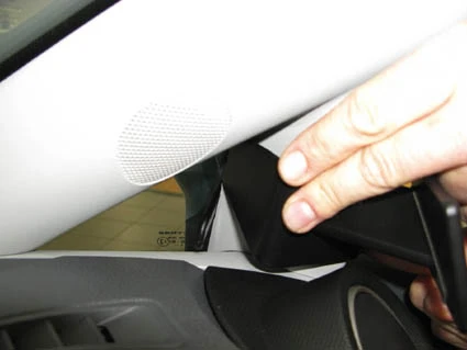 Press the angled edge of the ProClip into the gap between the rubber sealent and the A-post and hook it around the A-post.