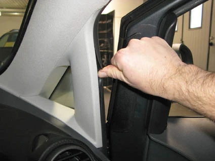 Peel off the cover of the adhesive tape on the ProClip. Pull out the rubber sealent on the A-post slightly to widen the gap.