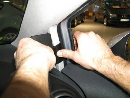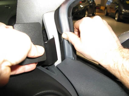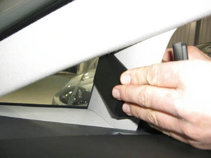 Peel off the cover of the adhesive tape on the ProClip. Pull out the rubber sealent on the A-post slightly to widen the gap.