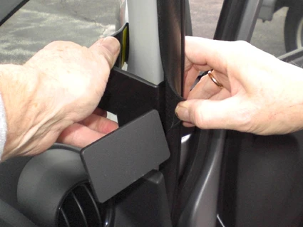 Press firmly upwards with your right hand on the bottom part of the ProClip and rightward on the left side of the ProClip with your other hand. Press until you see or hear/feel the angled edge on the upper part of the ProClip hook around the A-post panel edge.