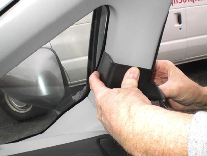 Peel off the cover of adhesive tape on the ProClip. Press your thumb into the gap between the A-post panel frame and the rubber sealant, to widen the gap. Insert the angled edge on the lower part of the ProClip into the gap and hook it behind the A-post panel edge.