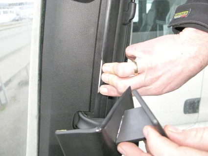 Use the enclosed alcohol pad to clean the area where the ProClip is to be installed. Peel off the adhesive tape cover on the ProClip. Pull out the rubber sealent on the A-post slightly to widen the gap.