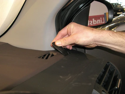 Use the enclosed alcohol pad to clean the area where the ProClip is to be installed. Peel off the adheisve tape cover on the ProClip. Press the thin end of the enclosed gap opener into the gap on top of the dashboard, to widen the gap.