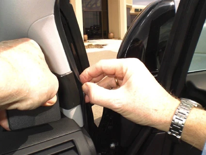 Peel off the cover of adhesive tape on the ProClip. Press your thumb into the gap between the A-post panel frame and the rubber sealant, to widen the gap. Insert the angled edge on the lower part of the ProClip into the gap and hook it behind the A-post panel edge.