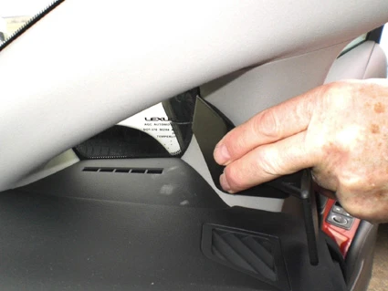 Press firmly leftwards on the left side of the ProClip until you see or hear/feel the angled edge on the upper part of the ProClip hook around the A-post panel edge.