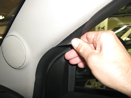 Use the enclosed alcohol pad to clean the area where the ProClip is to be installed. Peel off the cover of adhesive tape on the ProClip. Press your thumb into the gap between the A-post panel frame and the rubber sealant, to widen the gap.