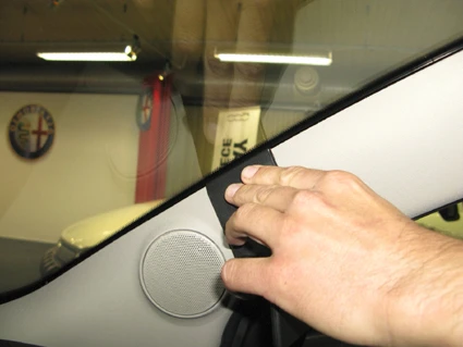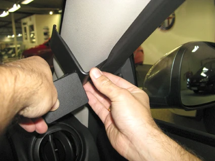 Insert the angled edge on the lower part of the ProClip into the gap and hook it behind the A-post panel edge.
