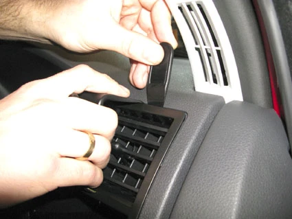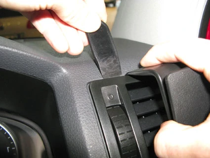 Pull out the gap opener and press it into the gap between the frame surrounding the air vent and the dashboard (on the right side of the ProClip) and hold it in place. Press down on the right side of the upper part of the ProClip so all of the angled edge goes into the gap. Pull out the gap opener.