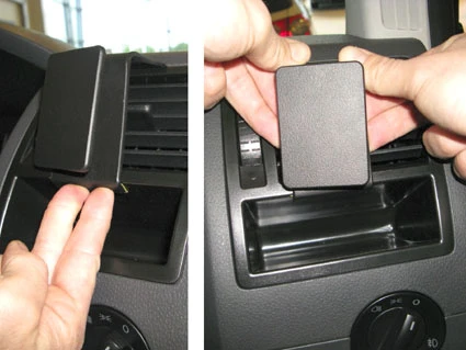Pull the ProClip toward you and press it downward. Hook the angled edge on the lower part under the frame surrounding the air vent. Press upward on the bottom part of the ProClip so the adhesive tape attaches.