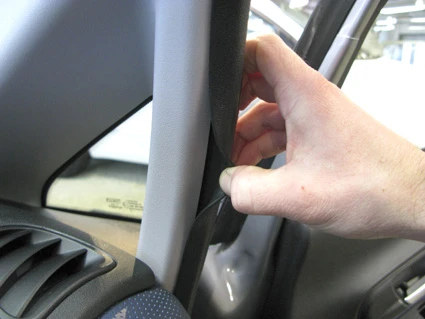 Use the enclosed alcohol pad to clean the area where the ProClip is to be installed. Peel off the adhesive tape cover on the ProClip. Pull out the rubber sealent on the A-post slightly, to widen the gap.