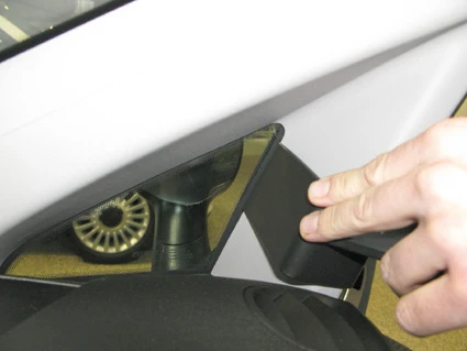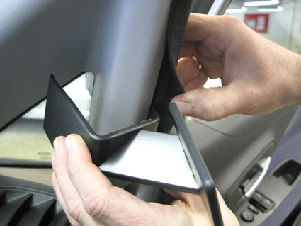 Press the ProClip upward/rightward so the upper angled edge hooks around the A-post. Press down on top of the ProClip so the angled edge hooks into place properly.