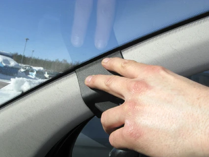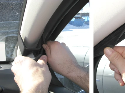 Use the enclosed alcohol pad to clean the area where the ProClip is to be installed. Peel off the adhesive tape cover on the ProClip. Pull out the rubber sealent on the A-post slightly, to widen the gap. Press the angled edge on the lower part of the ProClip into the gap and hook it behind the A-post.