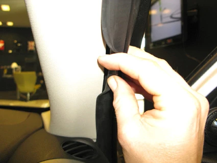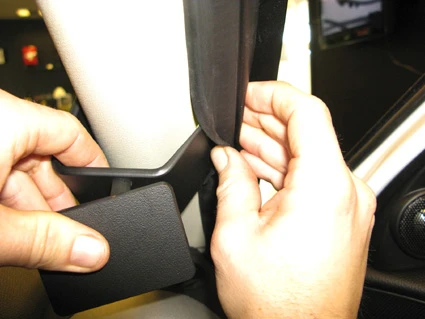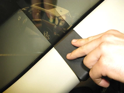 Use the enclosed alcohol pad to clean the area where the ProClip is to be installed. Peel off the adhesive tape covers on the ProClip. Pull out the rubber sealent on the A-post slightly.