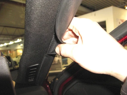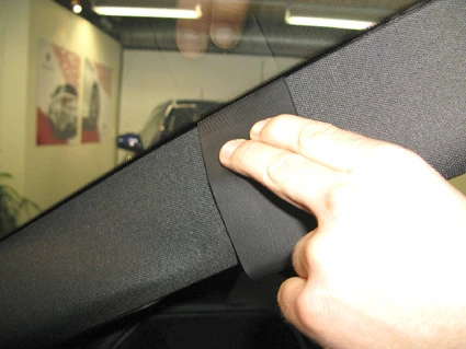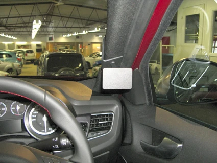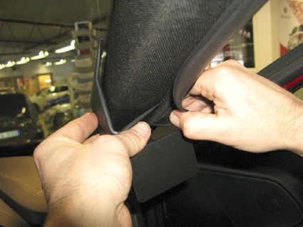 Press the ProClip upward/forward so the angled upper edge hooks around the A-post. Press down on top of the ProClip so the angled edge hooks into place properly.