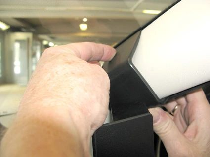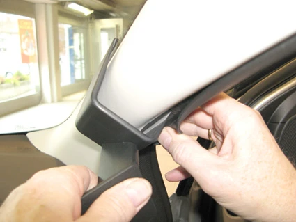 Use the enclosed alcohol pad to clean the area where the ProClip is to be installed. Peel off the adhesive tape covers on the ProClip. Pull out the rubber sealent on the A-post slightly. Press the angled edge on the lower part of the ProClip into the gap and hook it around the A-post.