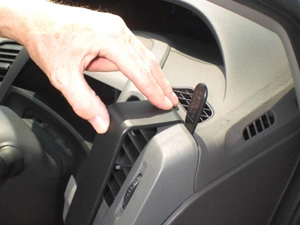 Press the gap opener into the seam/gap between the two dashboard parts. Press forward on the upper part of the ProClip so the angled edge goes into the gap next to the gap opener. Press until you see or hear/feel it click into place. Press down on top of the ProClip to make sure the angled edge is all the way into the gap.Pull out the gap opener.