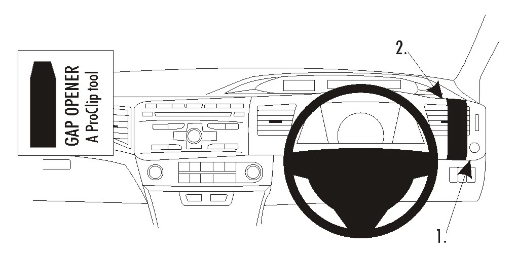 Press the thin end of the enclosed gap opener into the seam/gap between the two dashboard parts, to widen the gap. Use the enclosed alcohol pad to clean the area where the ProClip is to be installed. Peel off the adhesive tape cover on the ProClip. Press the angled edge on the lower part of the ProClip into the gap next to the gap opener. Pull out the gap opener.