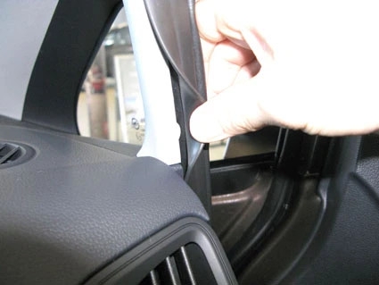 Press the ProClip upward/forward so the angled upper part hooks around the A-post. Press until you hear/feel it snaps into place.