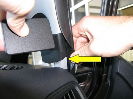 Place the ProClip right above the small oval part of the A-post (see arrow in picture). Press the angled edge on the lower part of the ProClip into the gap and hook it around the A-post.