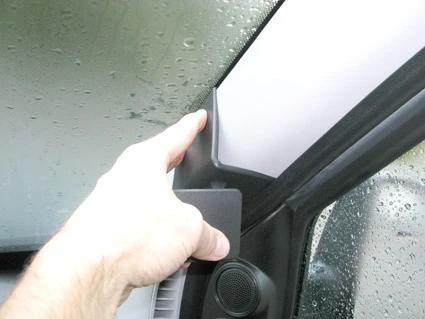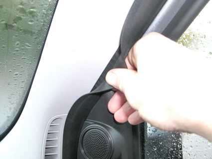 Use the enclosed alcohol pad to clean the area where the ProClip is to be installed. Peel off the adhesive tape covers on the ProClip. Pull out the rubber sealent on the A-post slightly.
