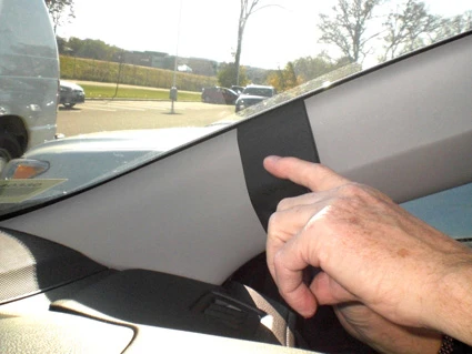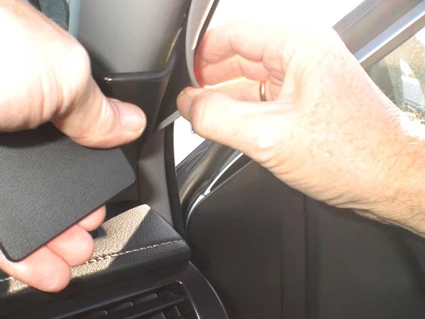 Use the enclosed alcohol pad to clean the area where the ProClip is to be installed. Peel off the cover of adhesive tape on the ProClip. Pull/flip the rubber sealant on the A-post open. Insert the angled edge on the lower part of the ProClip into the gap and hook it behind the A-post panel edge.