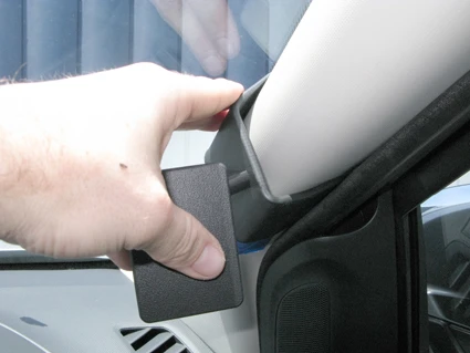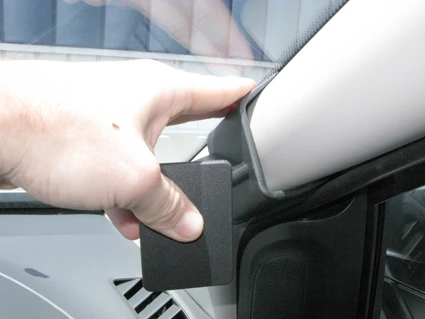 Press the ProClip upward/rightward so the upper angled edge hooks around the A-post. Press down on top of the ProClip so the angled edge hooks into place properly.