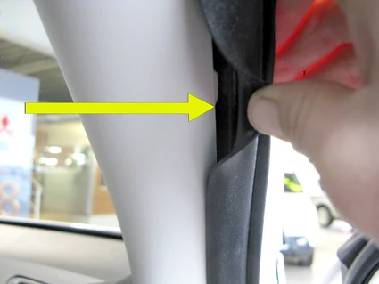 Use the enclosed alcohol pad to clean the area where the ProClip is to be installed. Peel off the adhesive tape cover on the ProClip. Pull out the rubber sealent on the A-post slightly. Note the small part of the A-post, the ProClip is to be installed directly below it. Place the upper edge of the lower part of the ProClip by the arrow shown in the picture.