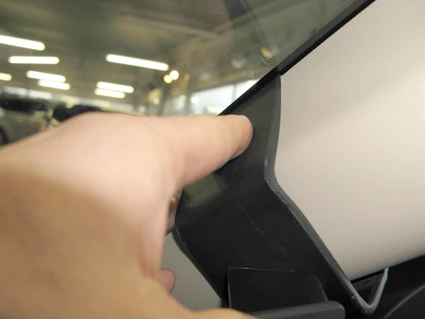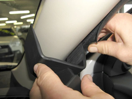 Press the ProClip upward/forward and hook the angled upper edge around the A-post. Press down on top of the ProClip so the angled edge goes all the way into the gap.