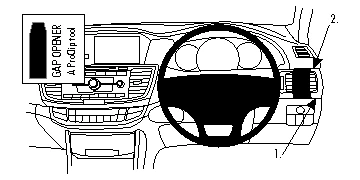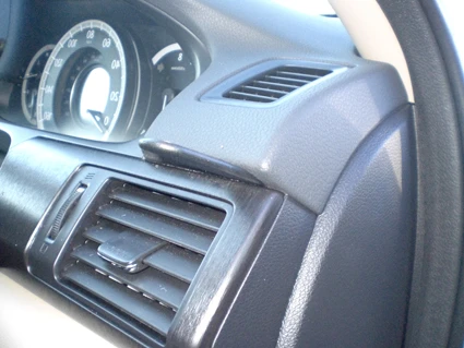Press the thin end of the enclosed gap opener into the gap between the air vent panel frame and the padded dashboard overhang, to widen the gap. Use the enclosed alcohol pad to clean the area where the ProClip is to be installed. Peel off the adhesive tape cover on the ProClip.