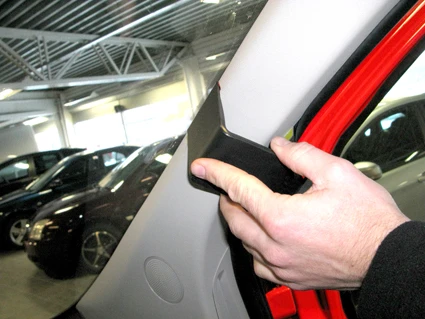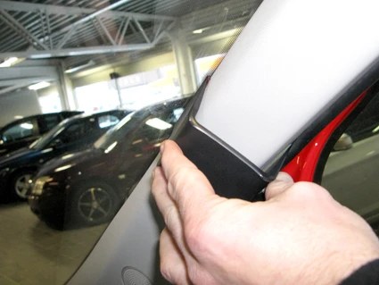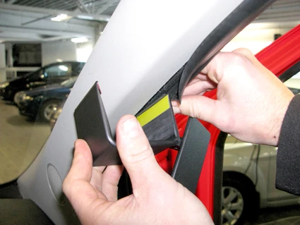 Peel off the adhesive tape covers on the ProClip. Pull out the rubber sealent on the A-post slightly. Press the angled edge on the lower part of the ProClip into the gap and hook it around the A-post.