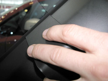 Use the enclosed alcohol pad to clean the area where the ProClip is to be installed. Peel off the adhesive tape covers on the ProClip. Pull out the rubber sealent on the A-post slightly. Press the angled edge on the lower part of the ProClip into the gap.