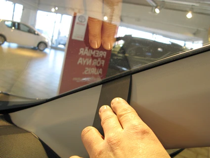 Use the enclosed alcohol pad to clean the area where the ProClip is to be installed. Peel off the adhesive tape covers on the ProClip. Pull out the rubber sealent on the A-post slightly. Press the angled edge on the lower part of the ProClip into the gap.