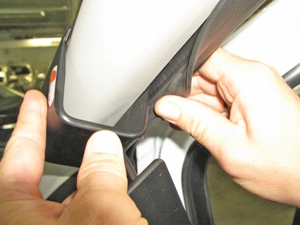 Use the enclosed alcohol pad to clean the area where the ProClip is to be installed. Pull out the rubber sealent on the A-post slightly. Remove the adhesive tape cover on the ProClip.