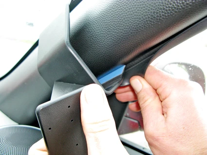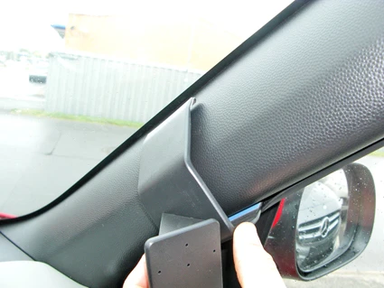 Press the ProClip upward/forward so the angled upper edge hooks around the A-post.
