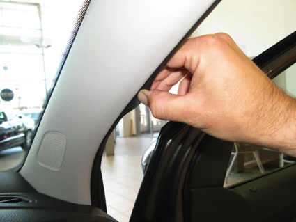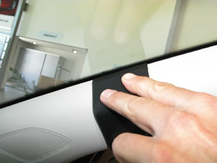 Peel off the cover of adhesive tape on the ProClip. Press your thumb into the gap between the A-post panel frame and the rubber sealant, to widen the gap.
