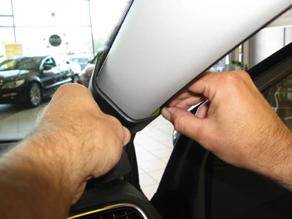 Press firmly upwards with your right hand on the lower part of the ProClip and rightward on the left side of the ProClip with your other hand. Press until you see or hear/feel the angled edge on the upper part of the ProClip hook around the A-post panel edge.